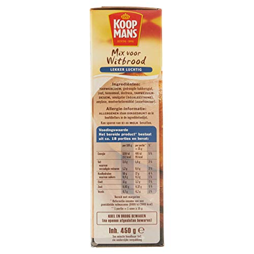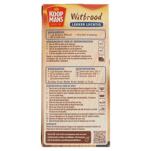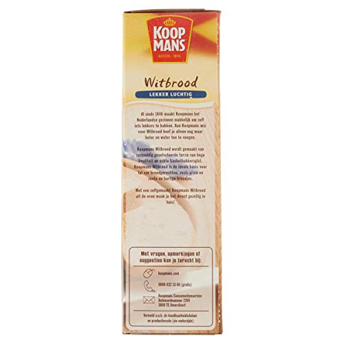 Aan Koopmans mix voor Witbrood hoef je alleen nog maar boter en water toe te voegen. Koopmans Witbrood wordt gemaakt van zorgvuldig geselecteerde tarwe van hoge kwaliteit en echte banketbakkersgist. Koopmans Witbrood is de ideale basis voor tal van broodgerechten, zoals pizza en zoete en hartige broodjes. Met een zelfgemaakt Koopmans Witbrood uit de oven maak je het direct gezellig in huis.