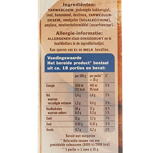 Ingrediënten: TARWEBLOEM, gedroogde bakkersgist, zout, bonenmeel, dextrose, TARWEZUURDESEM, emulgator (SOJALECITHINE), amylase, meelverbetermiddel (ascorbinezuur) Kan sporen van ei en melk bevatten.