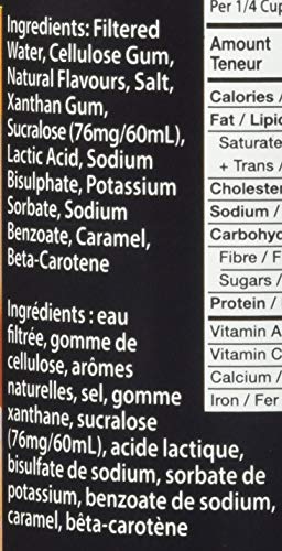 Drievoudig gefilterd gezuiverd water, cellulose gel, esdoorn smaakstof, sucralose, zout, natriumsulfaatzuur, xanthaan gom, natriumbenzoaat, kaliumsorbaat, karamel kleurstof, natuurlijke kleurstof en beta caroteen.